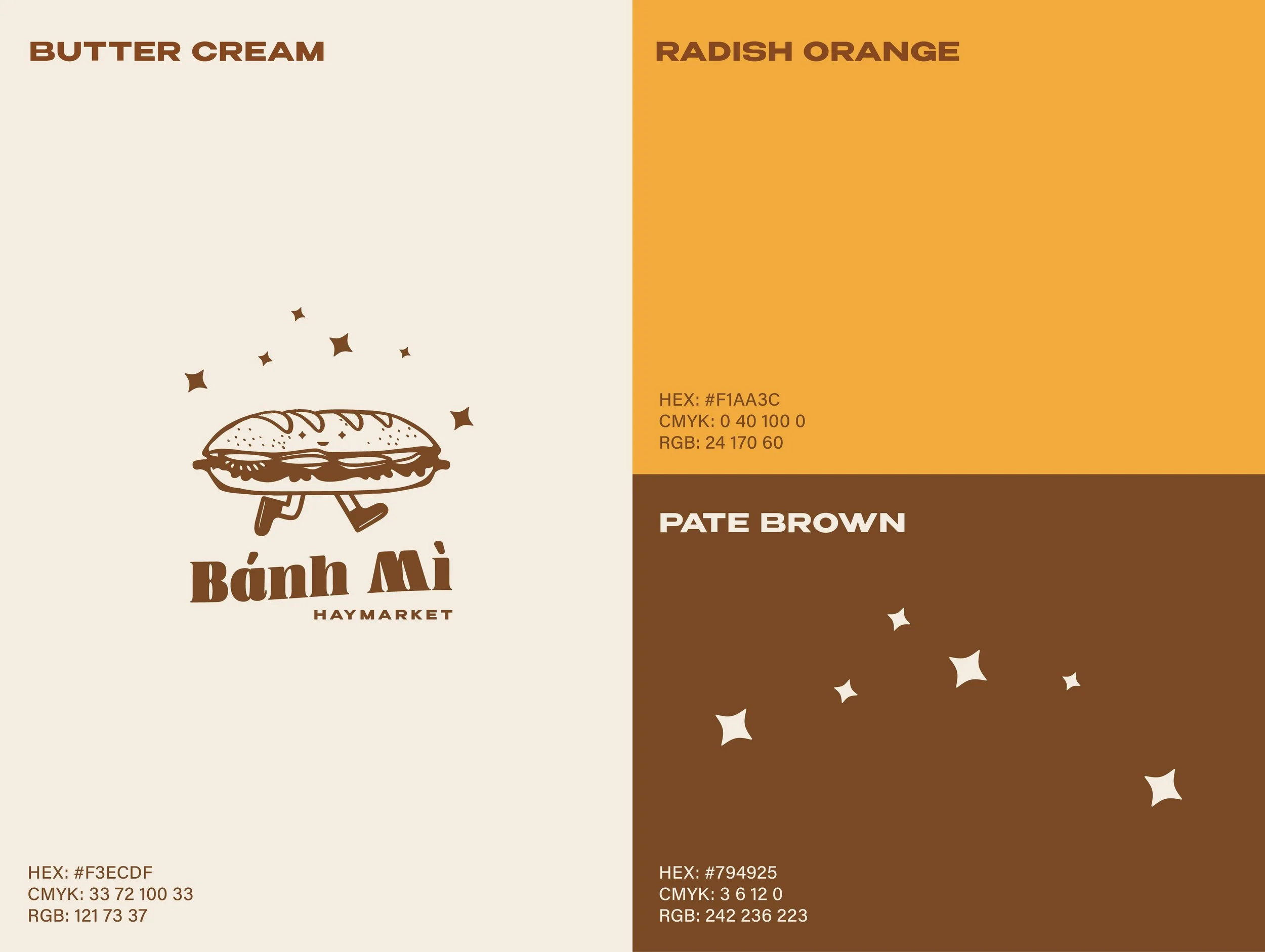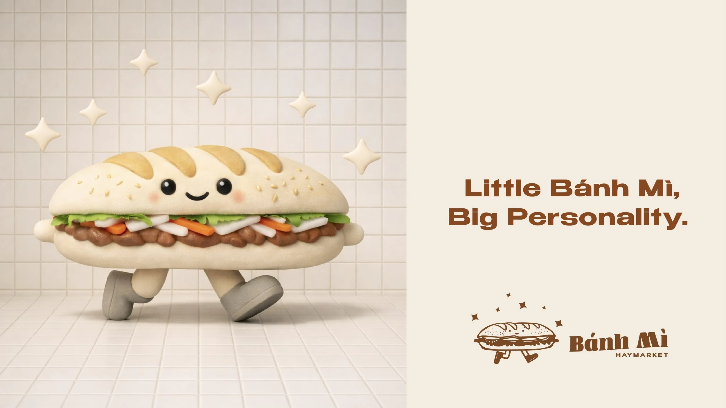 A vibrant bánh mì brand featuring a quirky, playful bánh mì mascot that brings personality and energy to the identity while celebrating the freshness and crunch of authentic Vietnamese flavours.